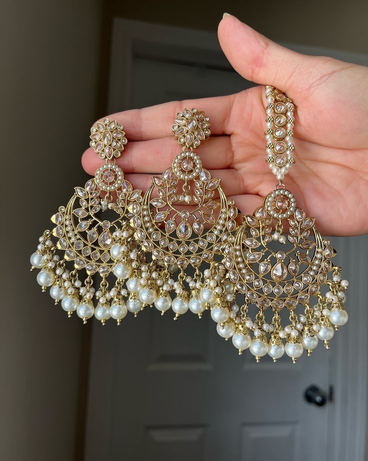 Add a regal touch to your traditional ensemble with this Indian’s Fashion Gold Tone Traditional Kundan & Beads Dangle Earring with Maang Tikka Set for women. Exquisitely crafted with intricate Kundan work and delicate bead detailing, this elegant jewelry set reflects timeless Indian heritage with a modern flair.